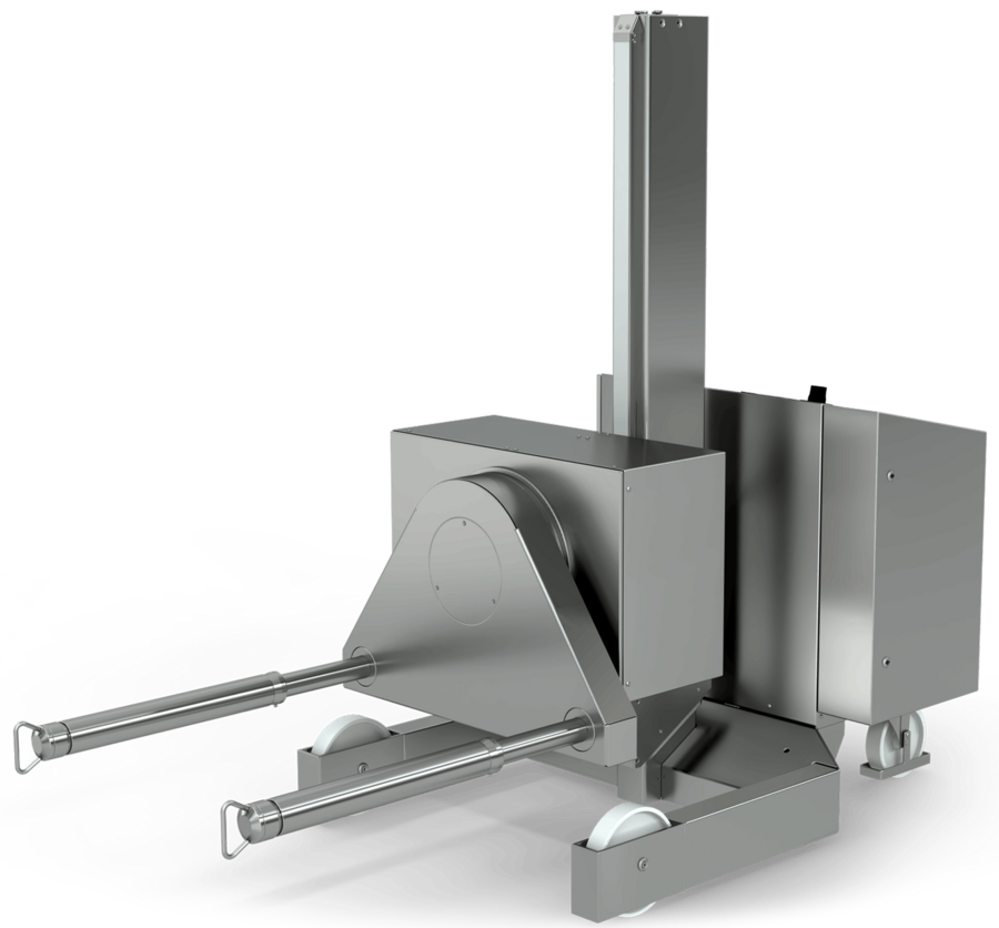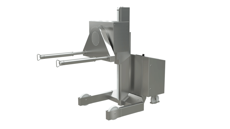 The centrepiece is the lift mast with outer and inner mast. This sliding mast principle ensures a GMP-compliant, hygienic and maintenance-friendly design. The hydraulic lift drive works with a plunger cylinder that is only pressurised with oil on one side and is connected to a powerful hydraulic unit.