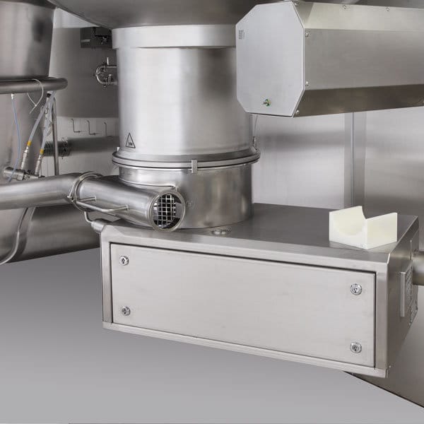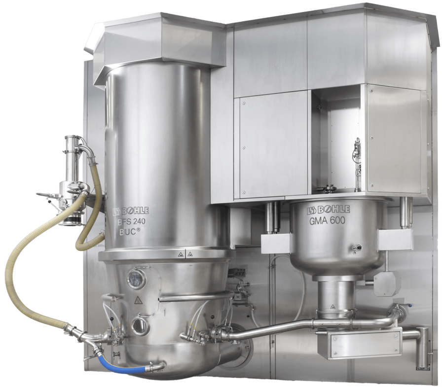 The compact granulation module allows for a particularly space-saving installation thanks to the components being arranged directly next to each other. In addition, a direct product transfer from the outlet valve of the GMA to the intake valve of the BFS is possible via a stainless steel pipe.