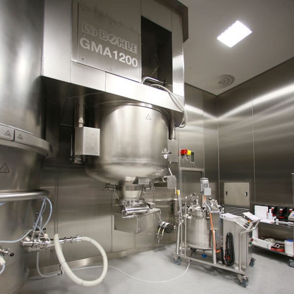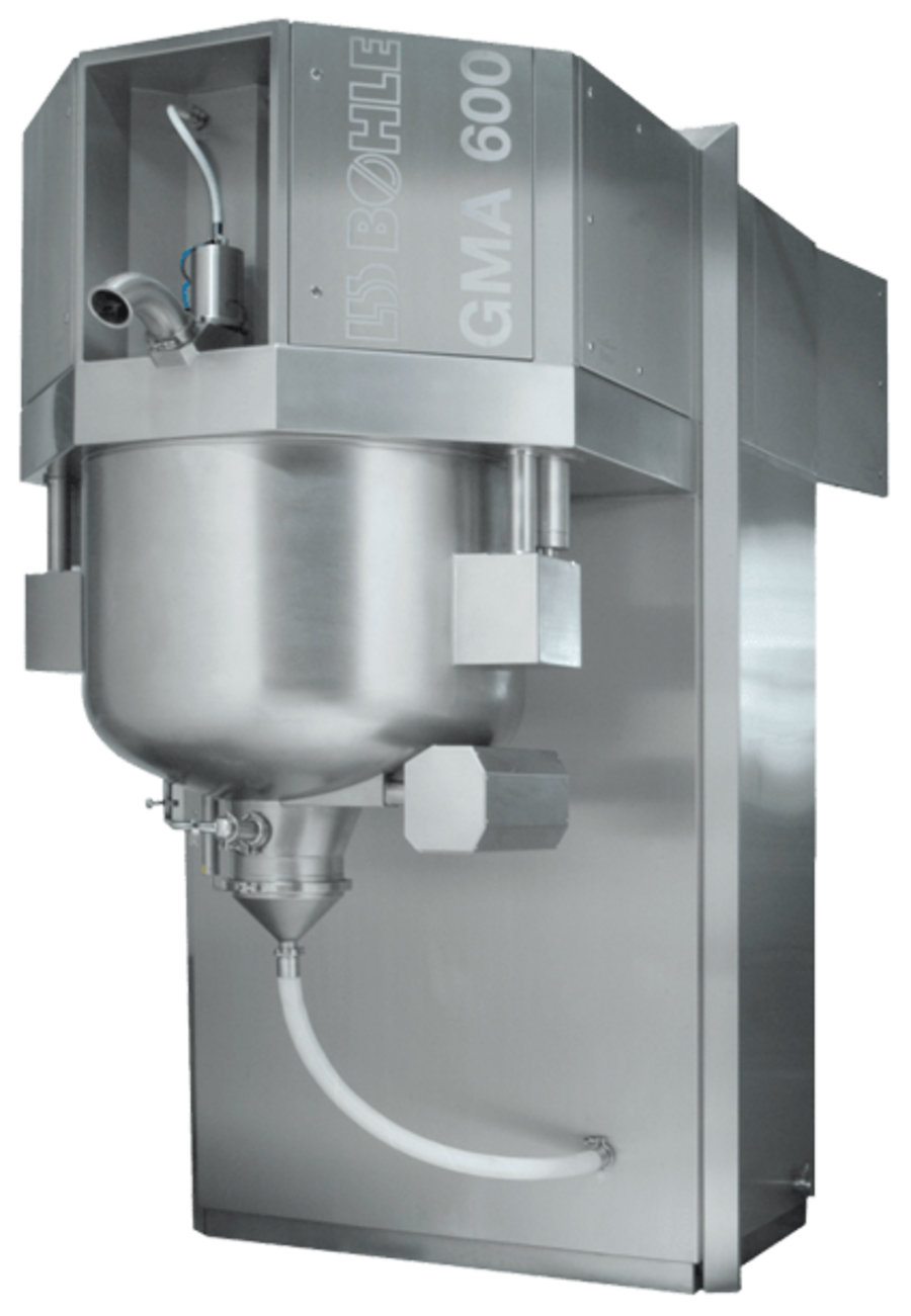 The GMA high-shear granulator is a granulation system specially optimised for pharmaceutical applications and designed for wall installation. The centrepiece of the GMA granulator is the cylindrical process vessel with a double-curved base. In combination with the agitator blade geometry, the container shape ensures effective granulation.