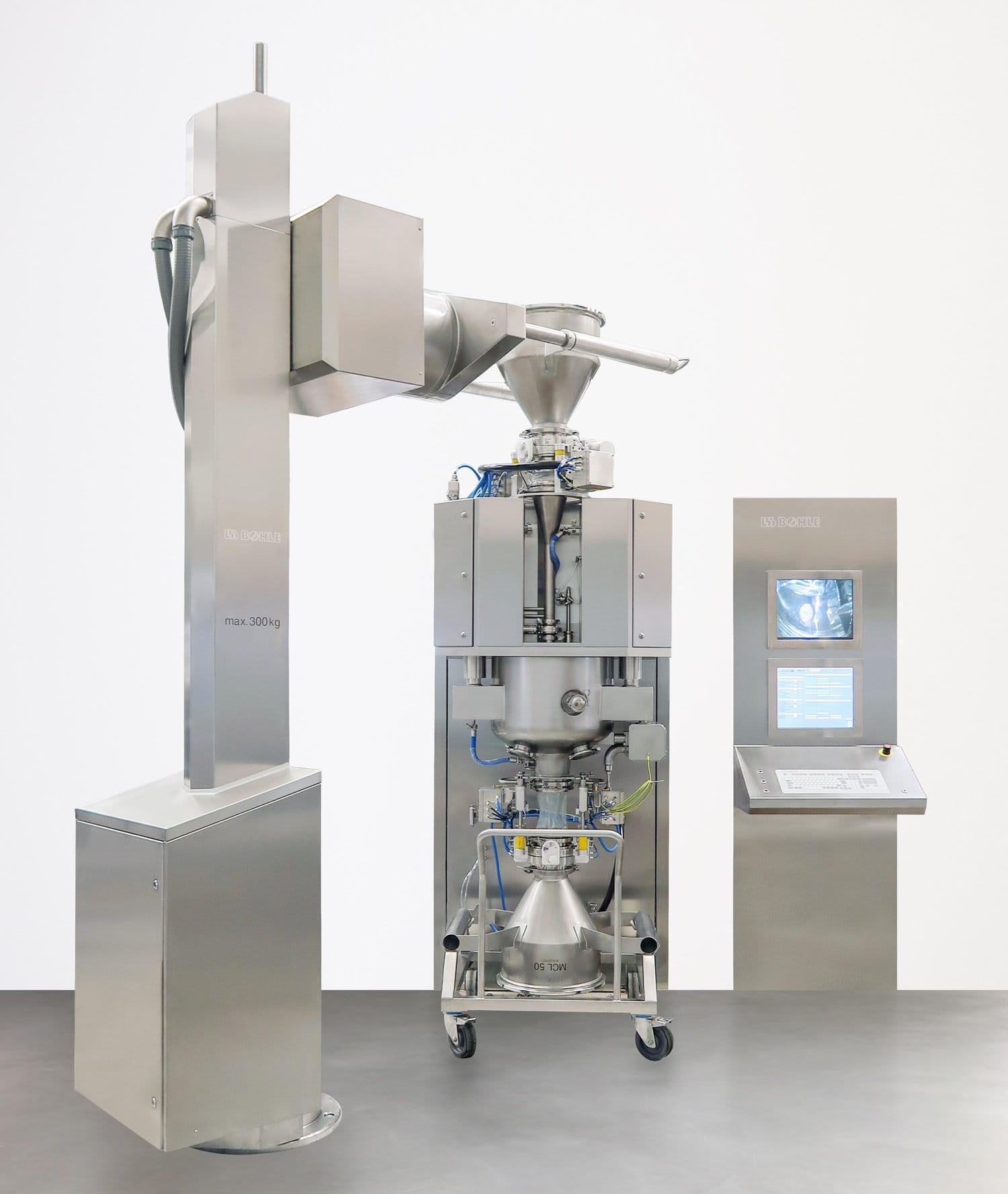 For example, lifting columns are used to feed process machines, such as Tableting or Tablet Coaters, or in complex production lines and packaging.
