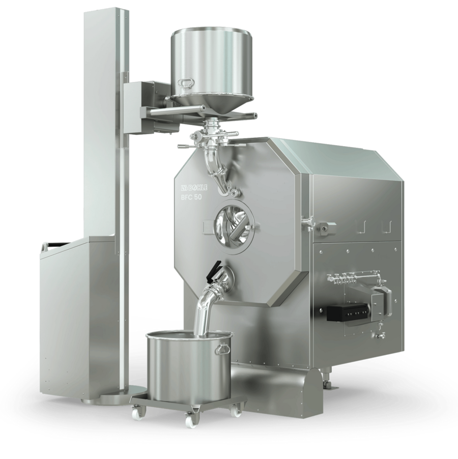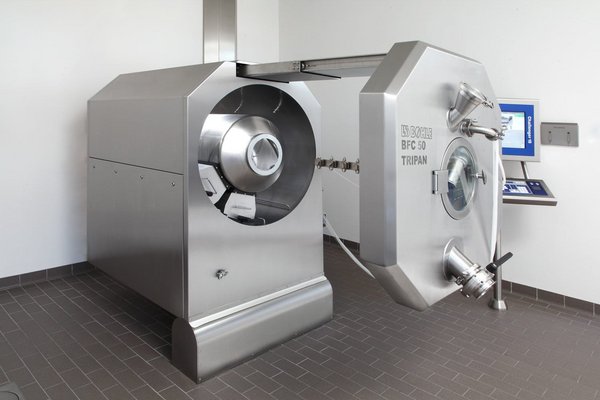The BFC 50 Tripan Tablet Coater is the perfect solution for demanding film coating processes on a small scale. The machine combines state-of-the-art technology with maximum flexibility and has been specially developed for the requirements of research, development and pilot production. Thanks to the interchangeable drums, different batch sizes of 7 - 50 litres can be realised. Reliable scaling and seamless transfer of processes to larger production systems is guaranteed.