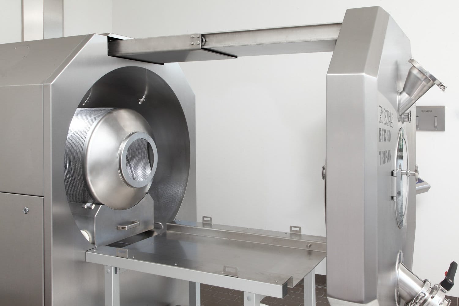 The TriPan film coater is a flexible coating system and can be operated with three different sized drums. By using different drums, batch sizes from 7 to 75 litres can be achieved. The coater drums can be changed quickly and easily using a lifting device.