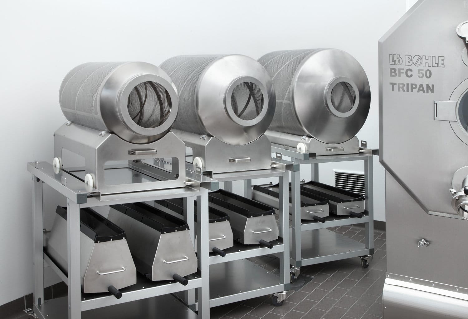 With three interchangeable drums, the TriPan enables flexible batch sizes from 7 to 75 litres and thus ensures uniform and efficient coating with minimal material loss.